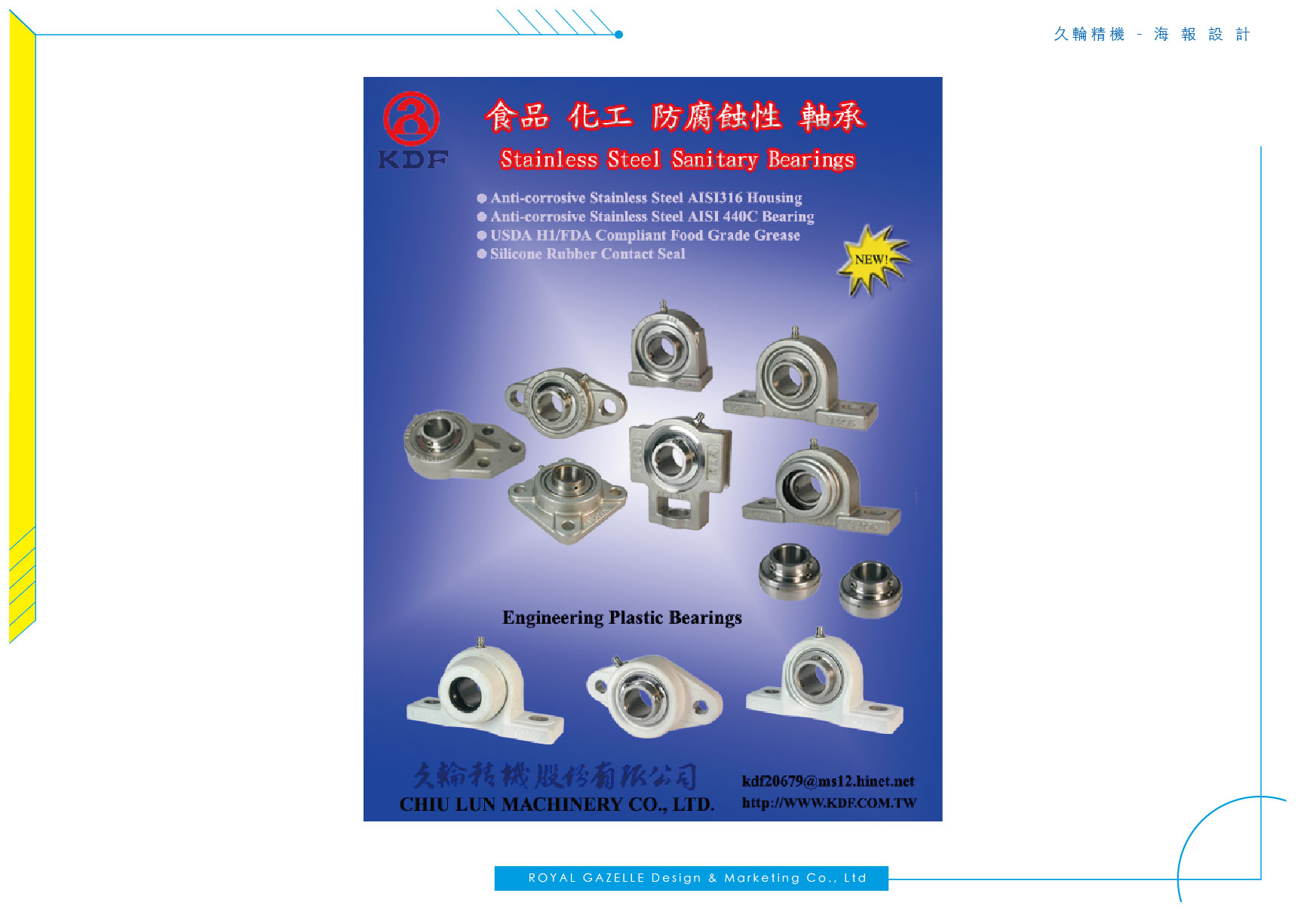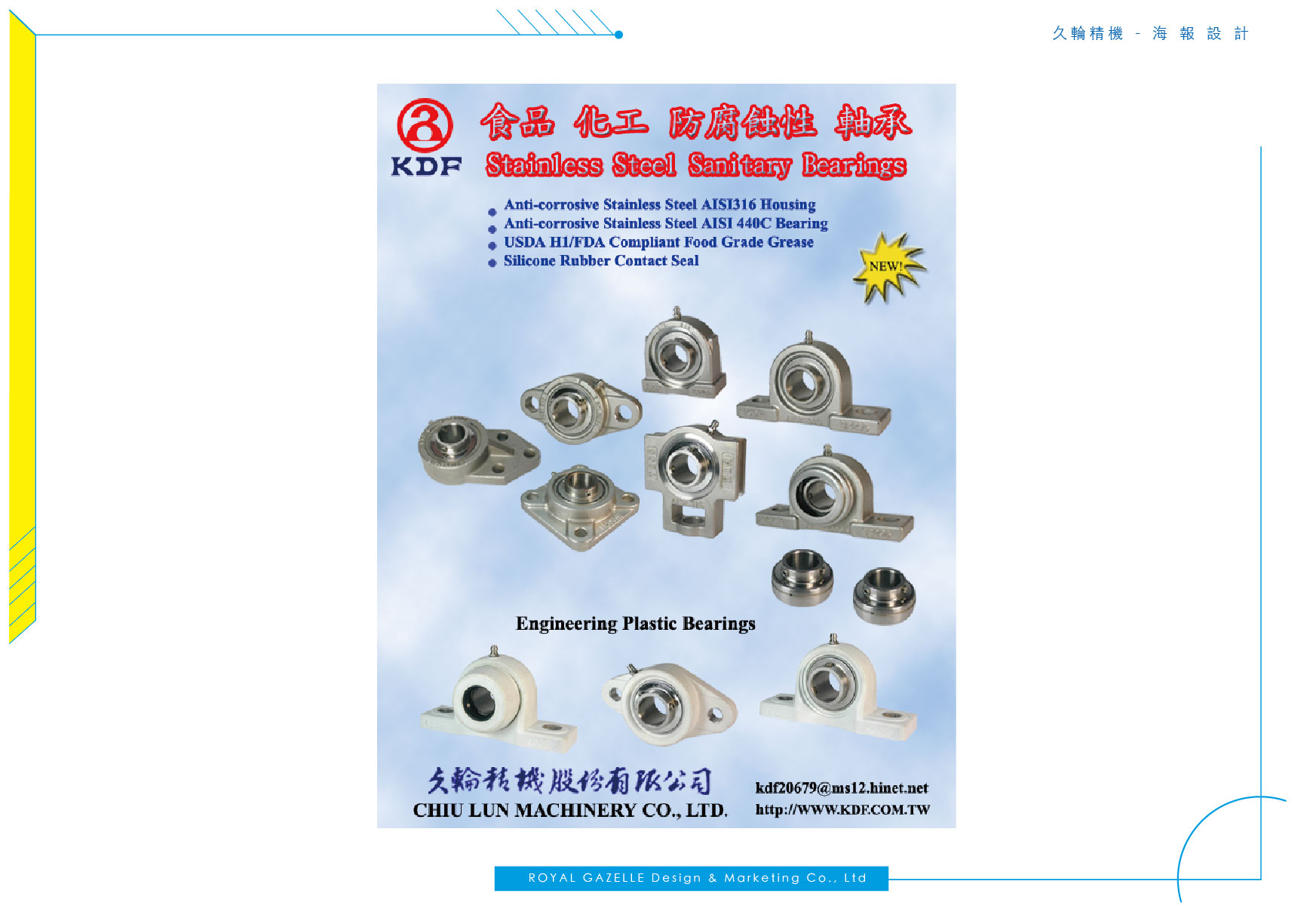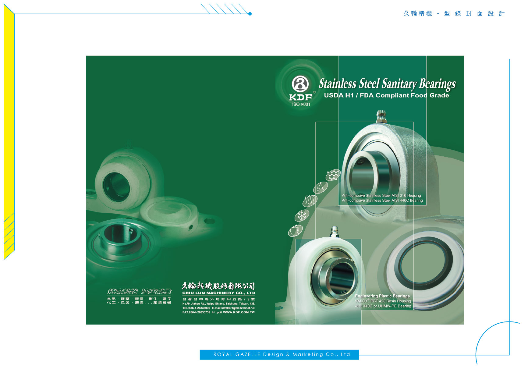 久輪精機股份有限公司成立於民國62年,專業經營軸承製造並致力於設計開發與持續改善軸承的耐用性與壽命。 替久輪精機設計之海報以深藍淺藍底色襯托其商品,以商品為主要重點來設計。 而型錄則以綠色為底輔以線條增添其工業風格之理性感。