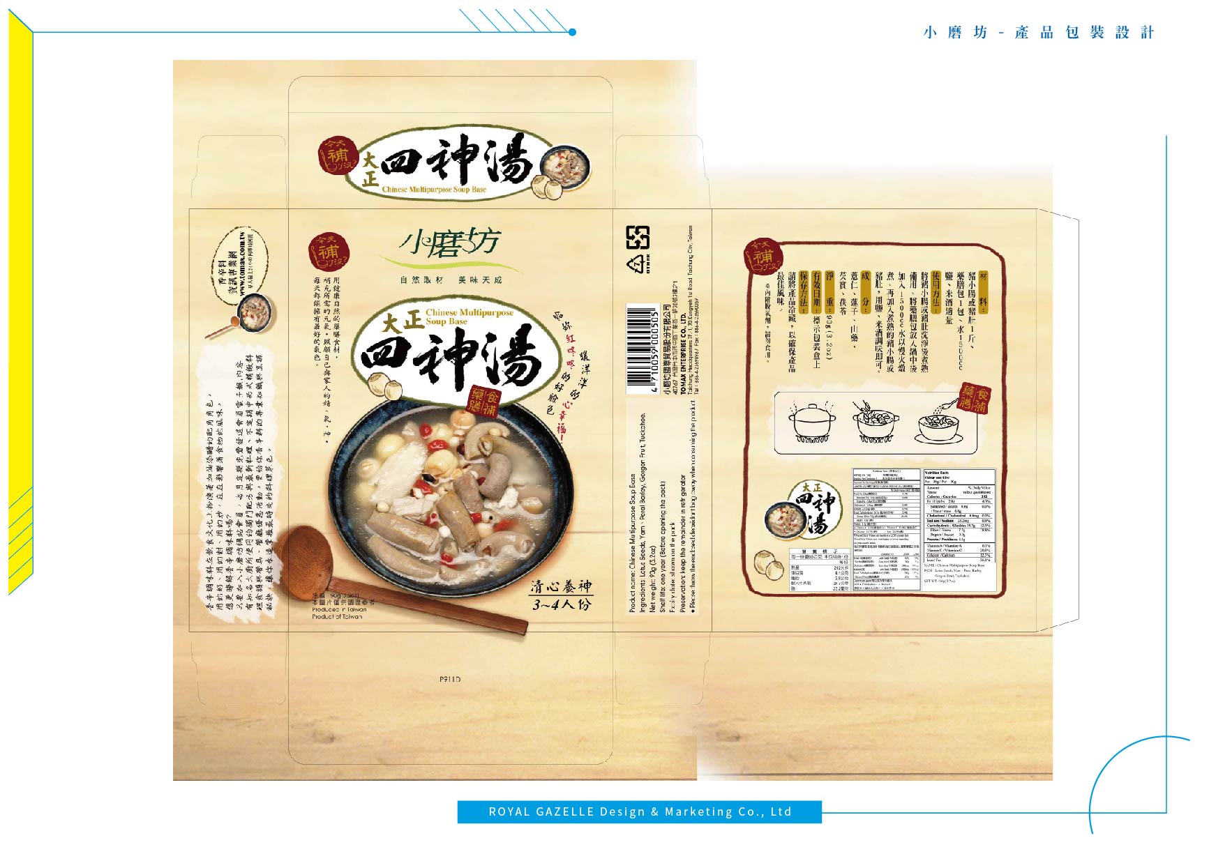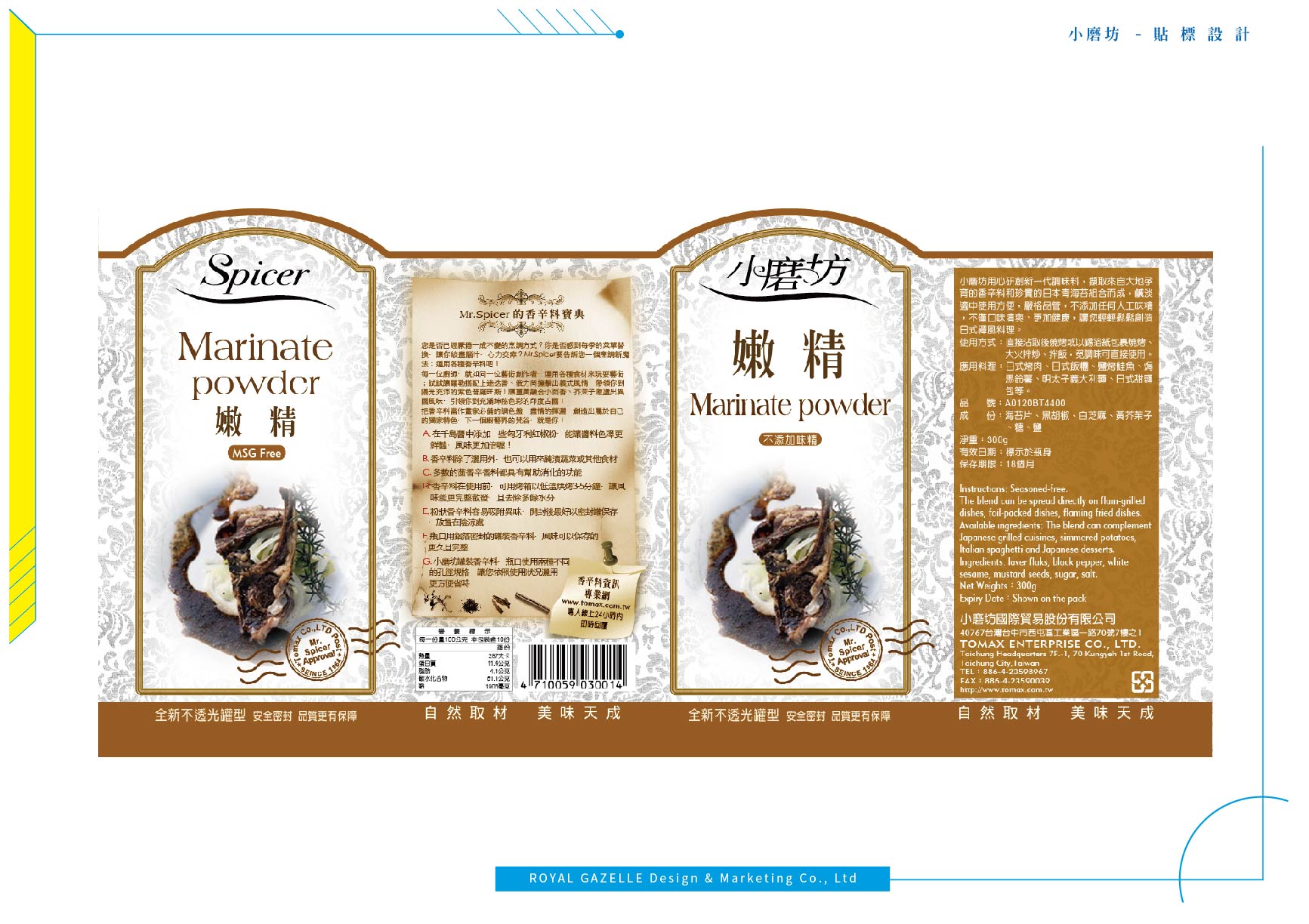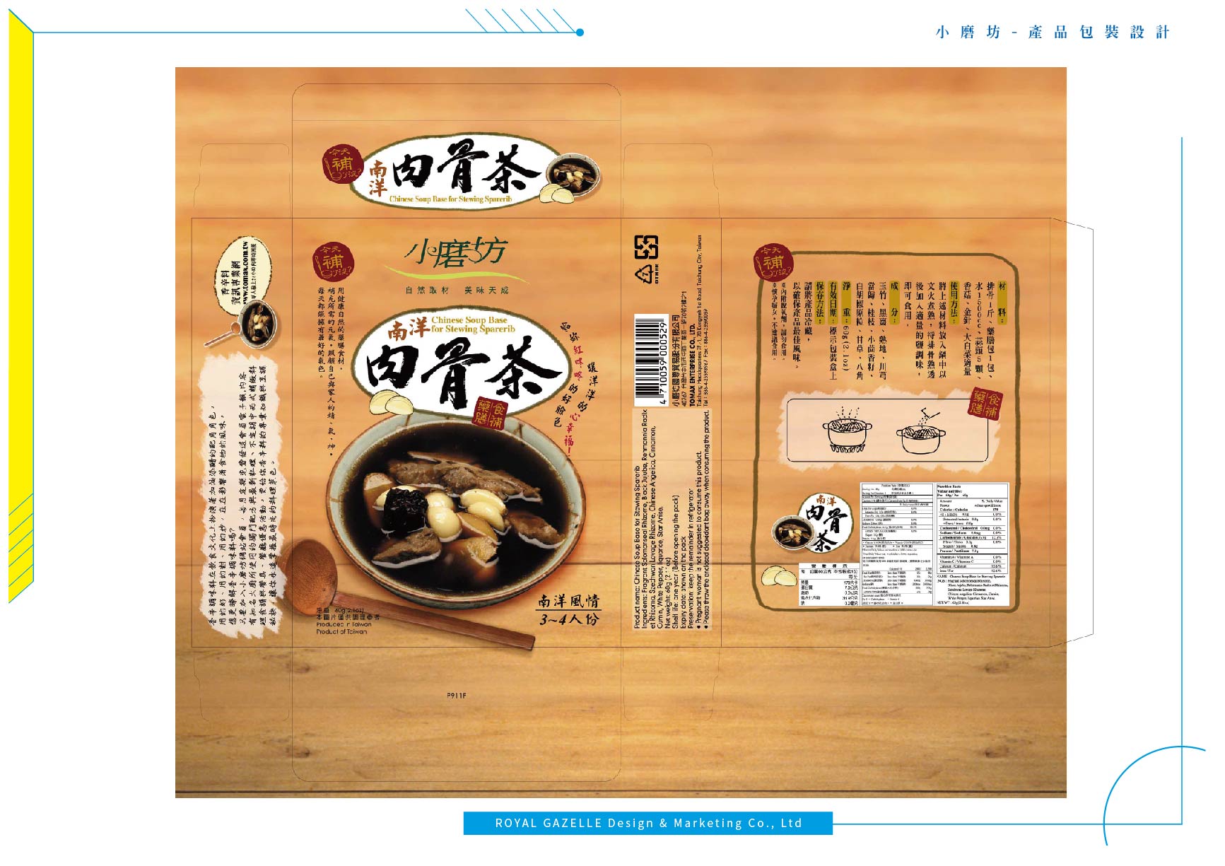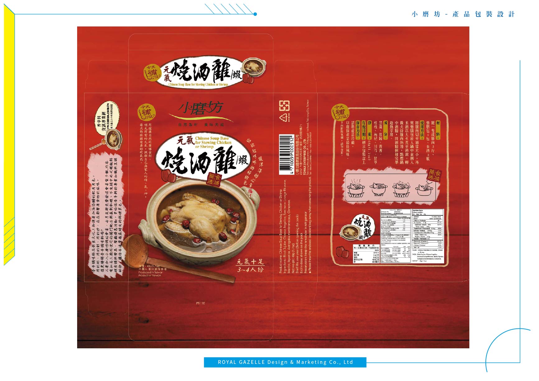 為台灣最大的食品調味料公司—小磨坊,設計的異國風情調味料貼標與食補藥膳包裝,調味料貼標之設計加上圖騰狀底紋,增加異國氣息,使調味料的滋味呈現於包裝中。食補藥膳則以暖色調為主要使用色系,使人感受到寒冬中的溫暖。