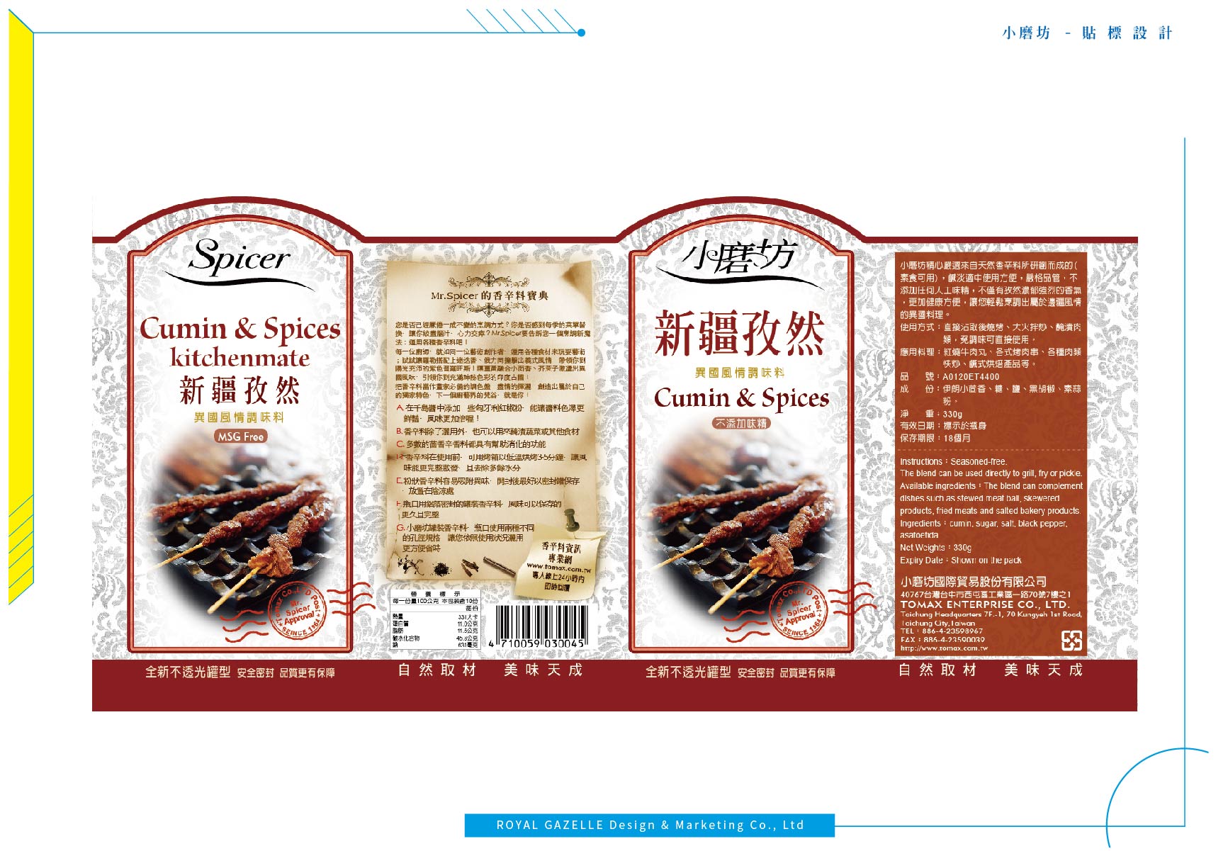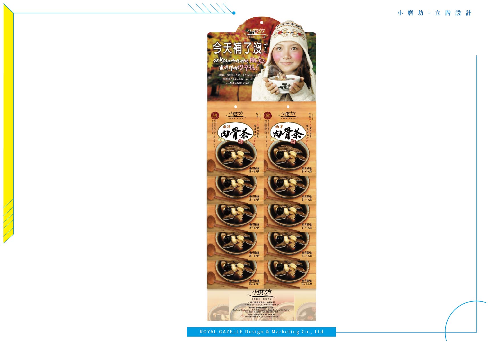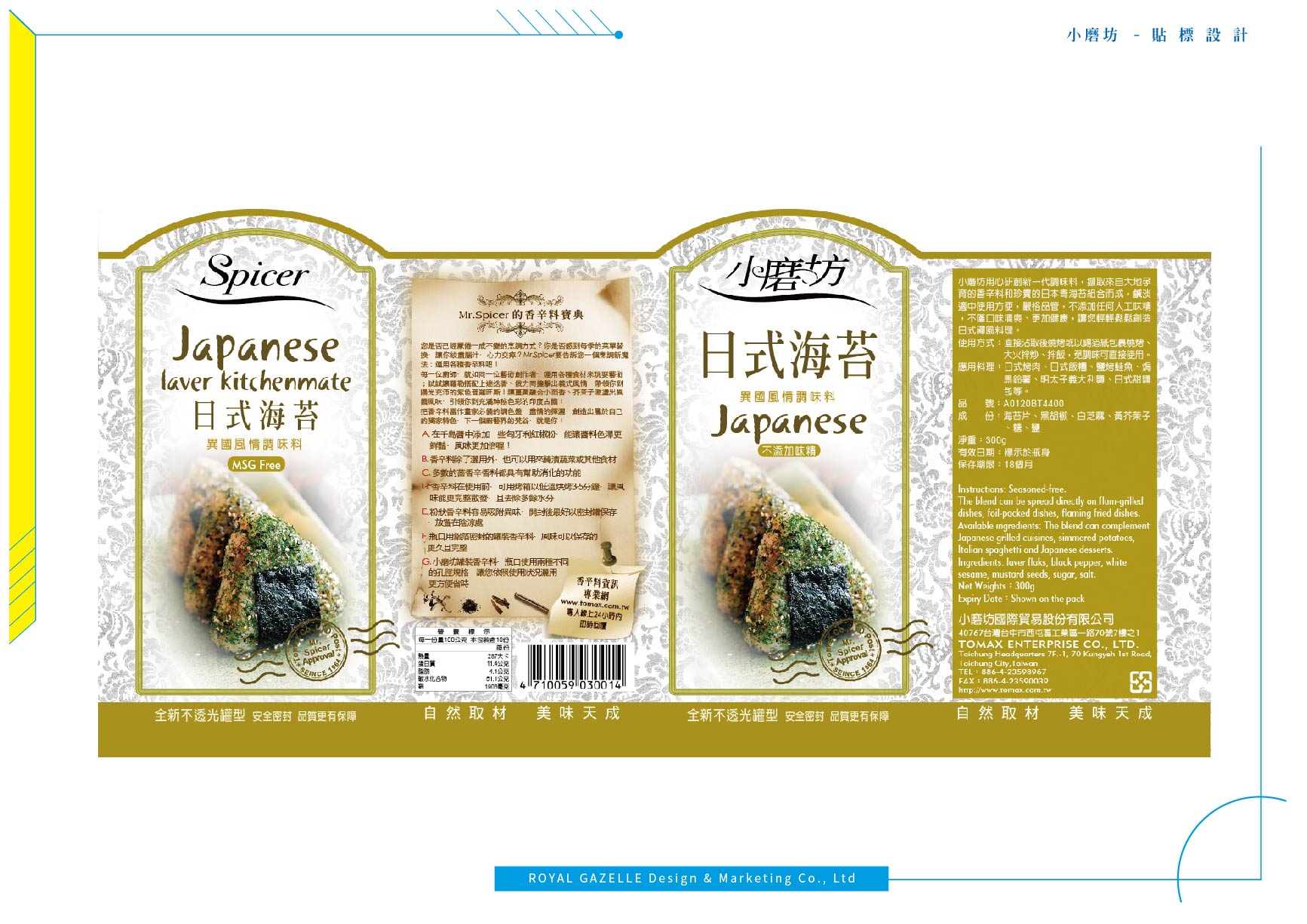 為台灣最大的食品調味料公司—小磨坊,設計的異國風情調味料貼標與食補藥膳包裝,調味料貼標之設計加上圖騰狀底紋,增加異國氣息,使調味料的滋味呈現於包裝中。食補藥膳則以暖色調為主要使用色系,使人感受到寒冬中的溫暖。