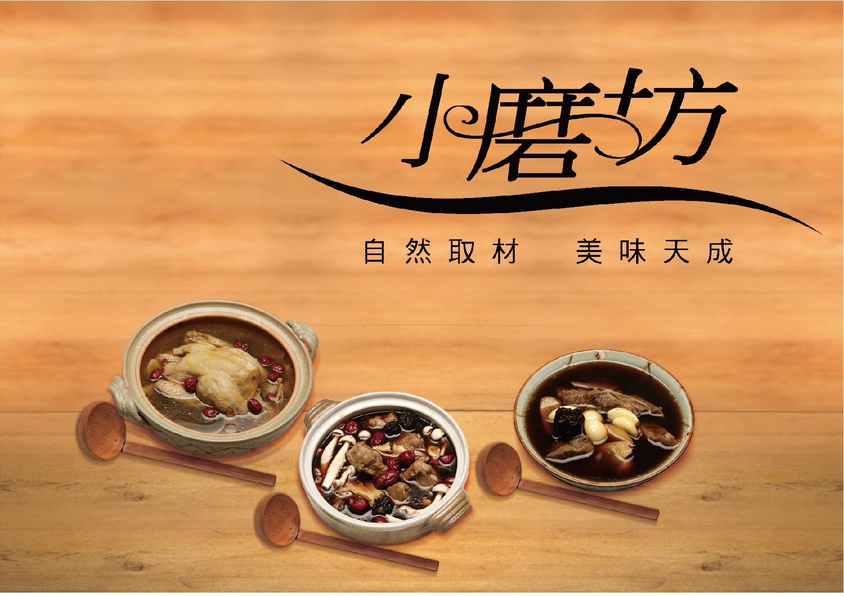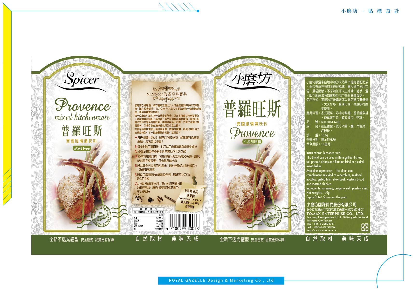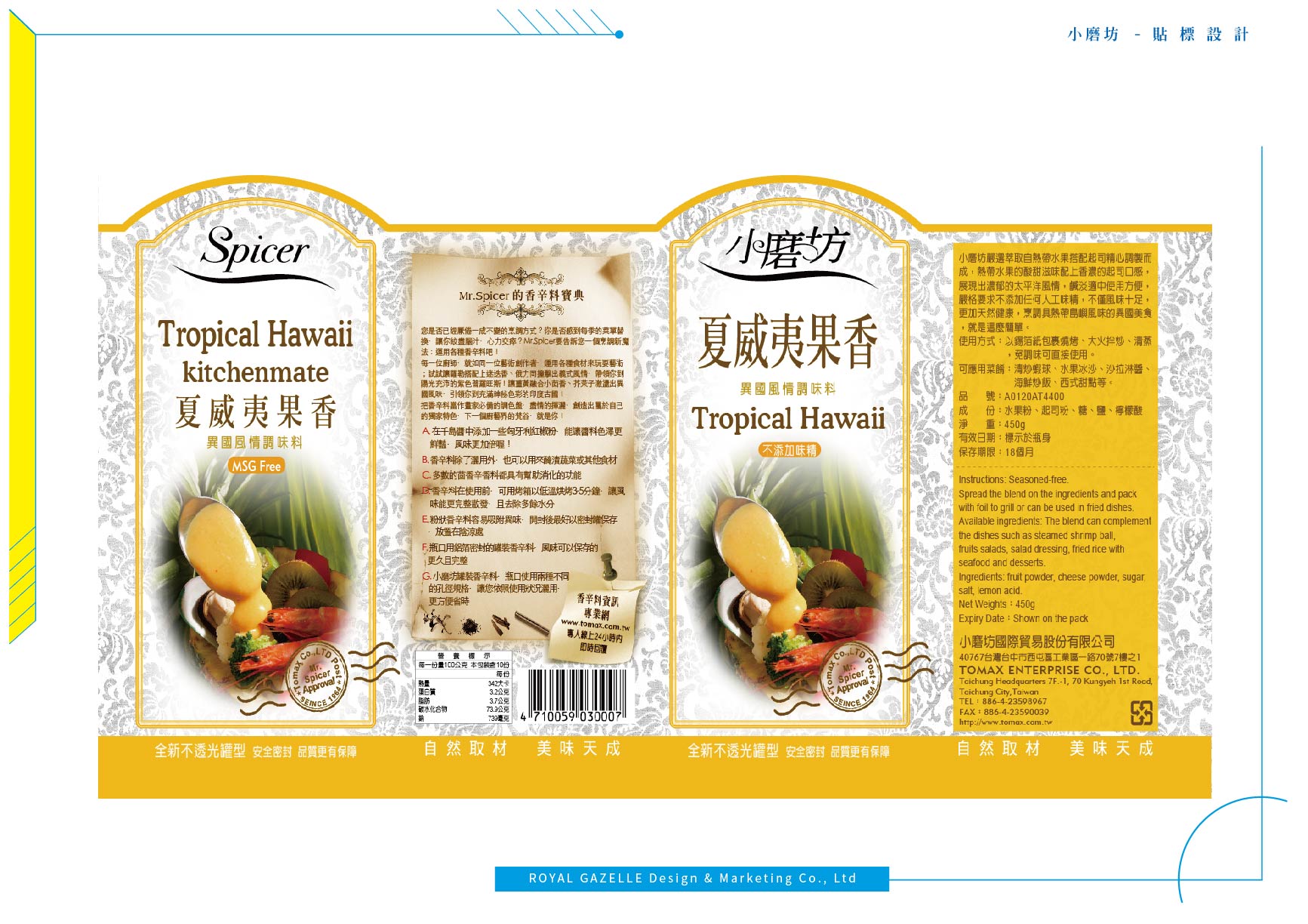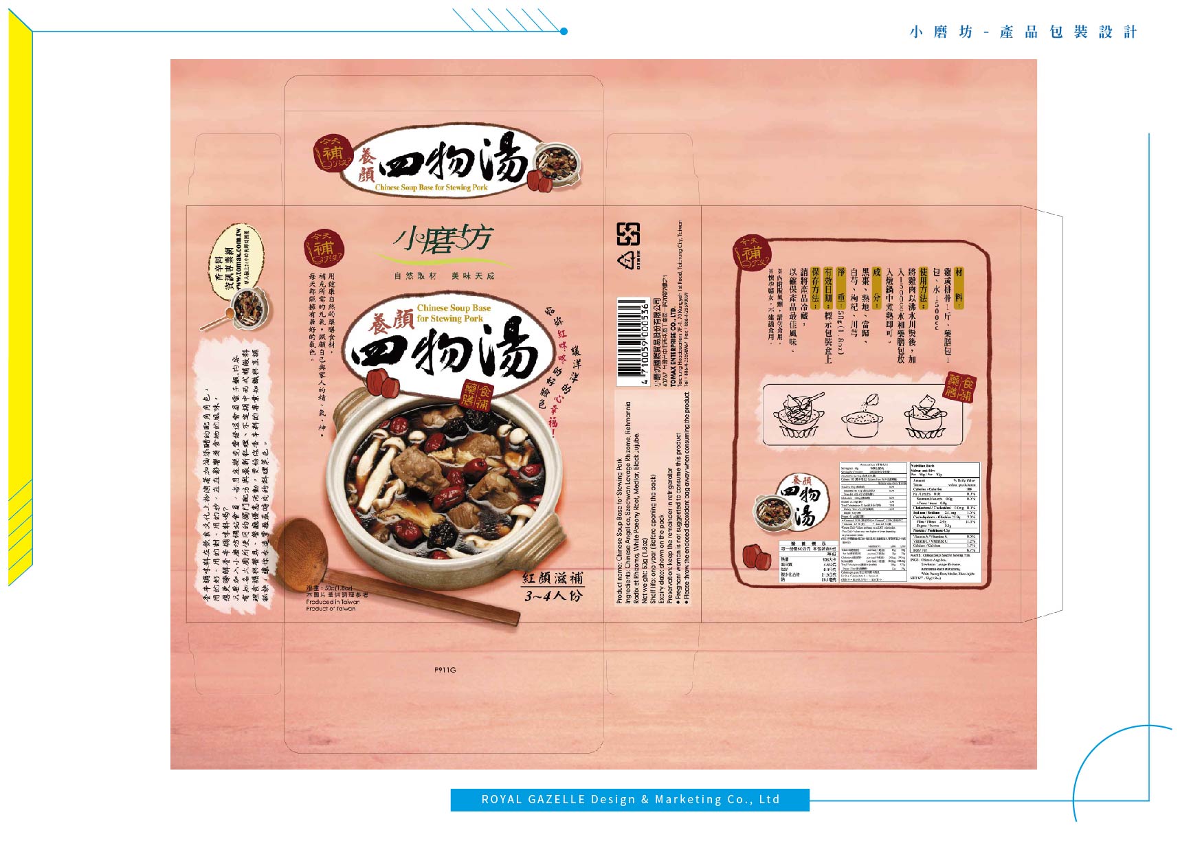 為台灣最大的食品調味料公司—小磨坊,設計的異國風情調味料貼標與食補藥膳包裝,調味料貼標之設計加上圖騰狀底紋,增加異國氣息,使調味料的滋味呈現於包裝中。食補藥膳則以暖色調為主要使用色系,使人感受到寒冬中的溫暖。