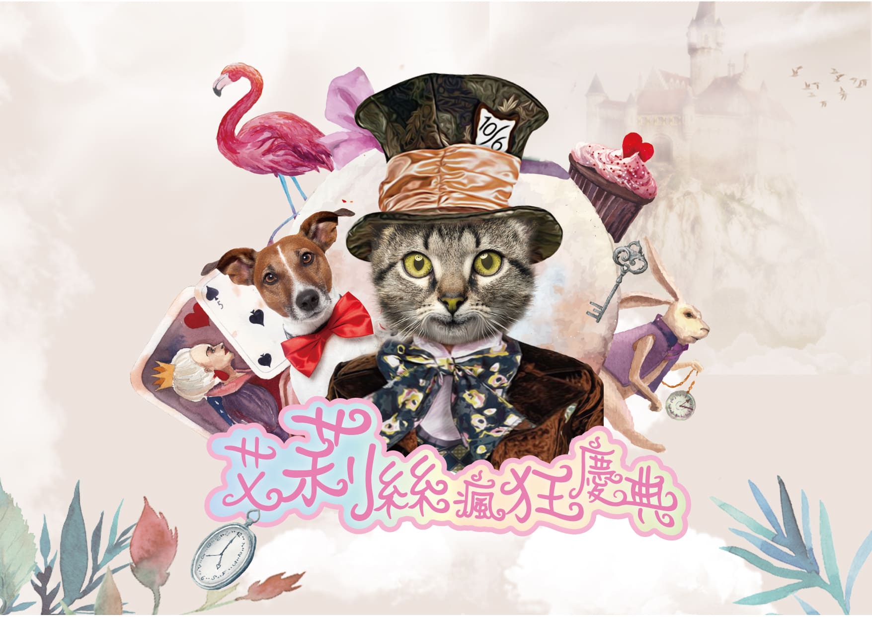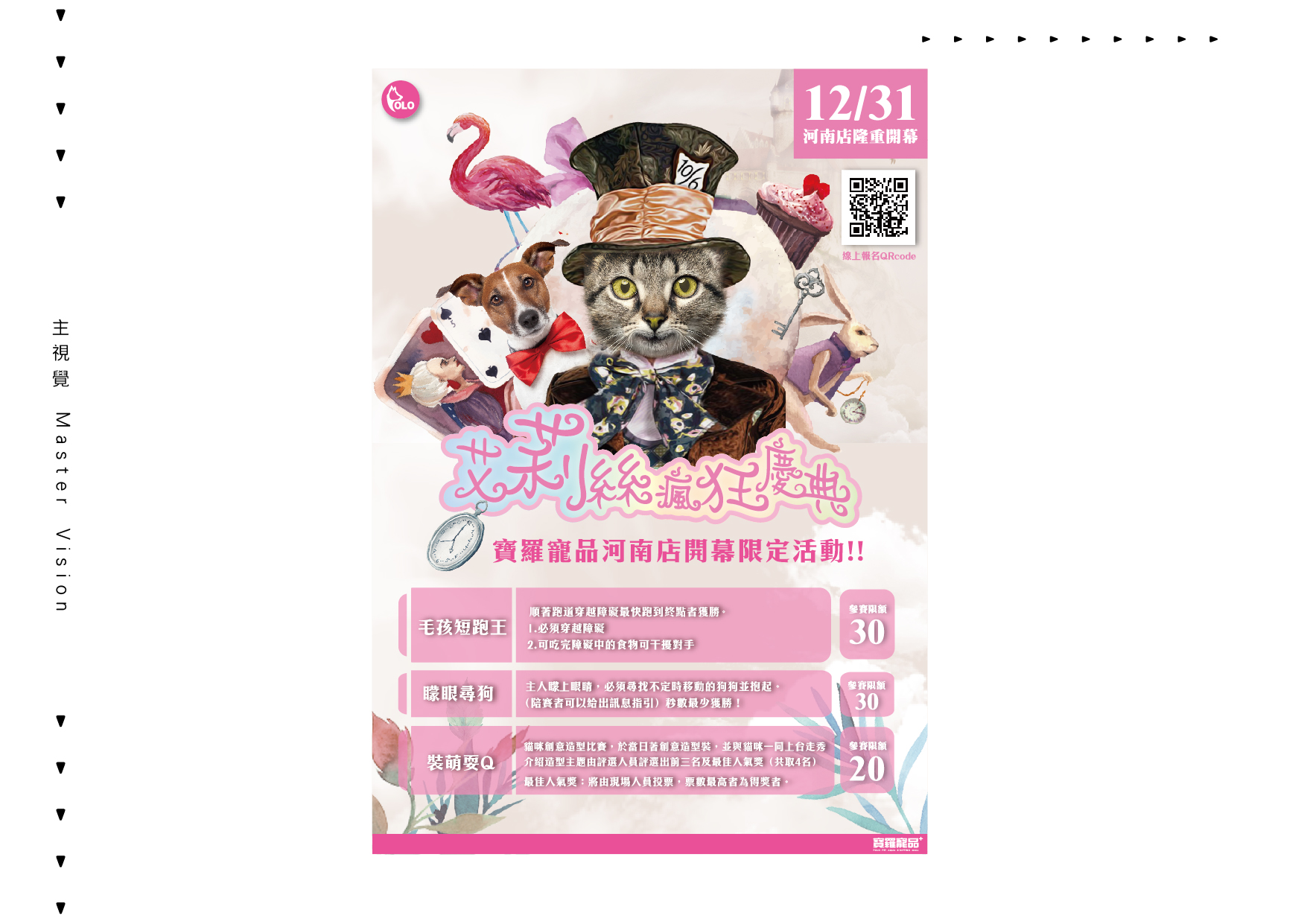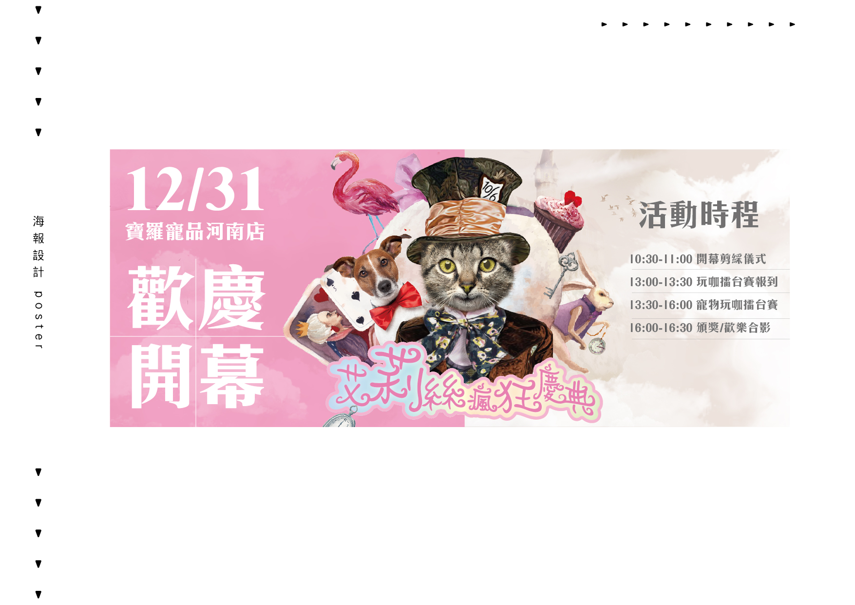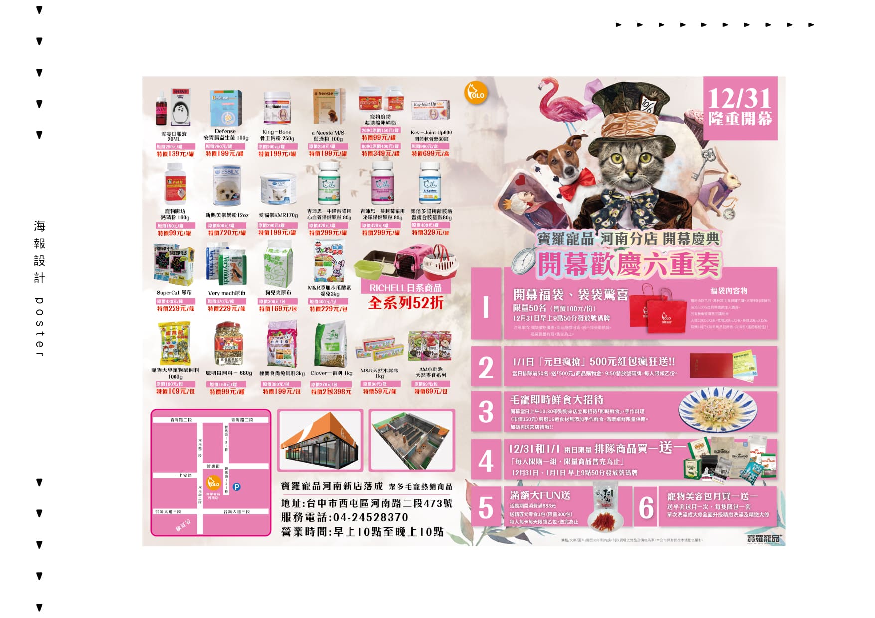 寶羅寵品-河南店開幕活動,河南店主要為「貓咪」的寵物店,販售貓咪的寵物用品及健康食品,開幕活動以童話故事《愛麗絲夢遊仙境》作為主題,將故事主角替換成貓星人,營造夢幻、童趣的氛圍,並規劃一系列整體視覺設計,包括店家DM海報、開幕活動文宣等。
