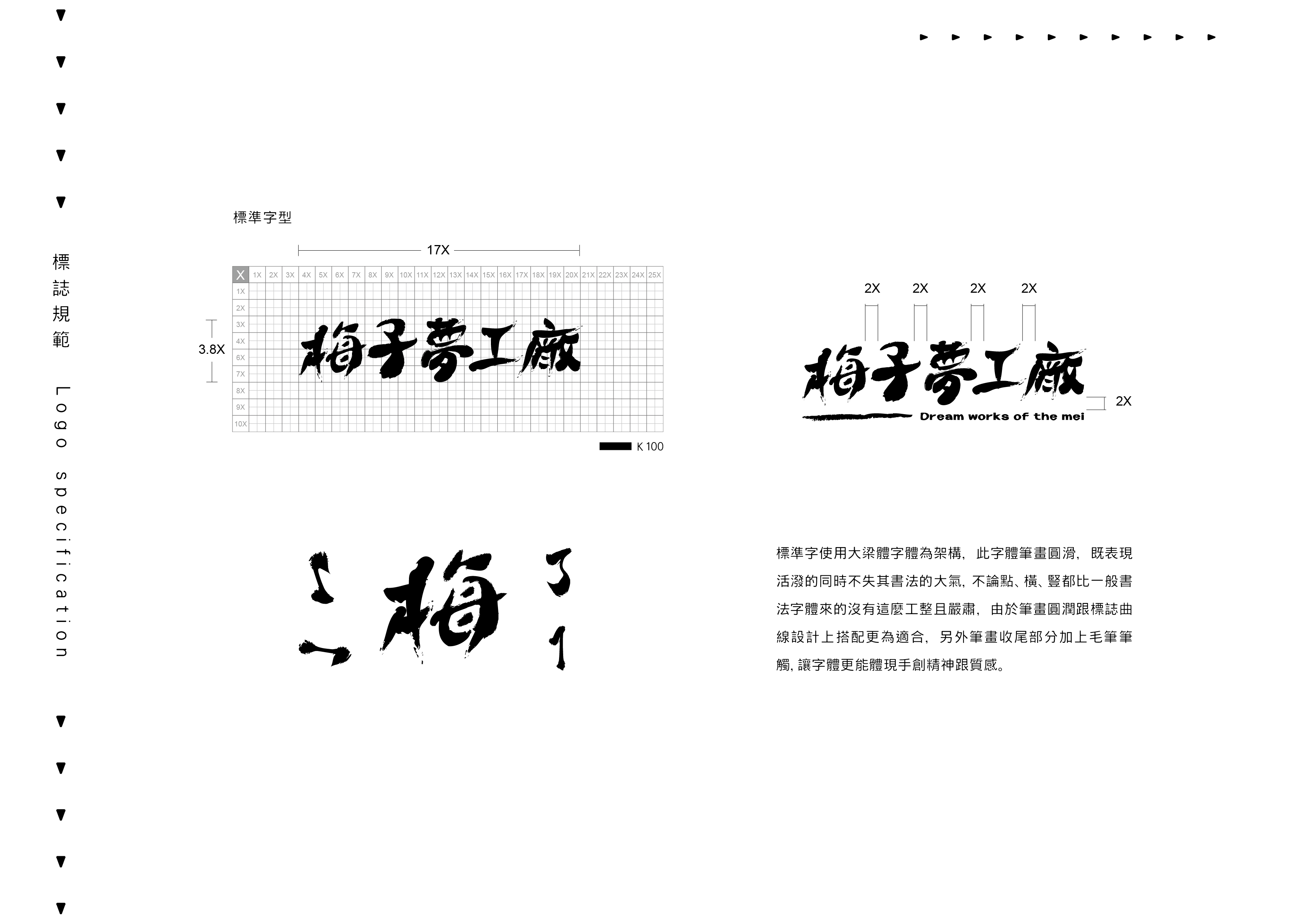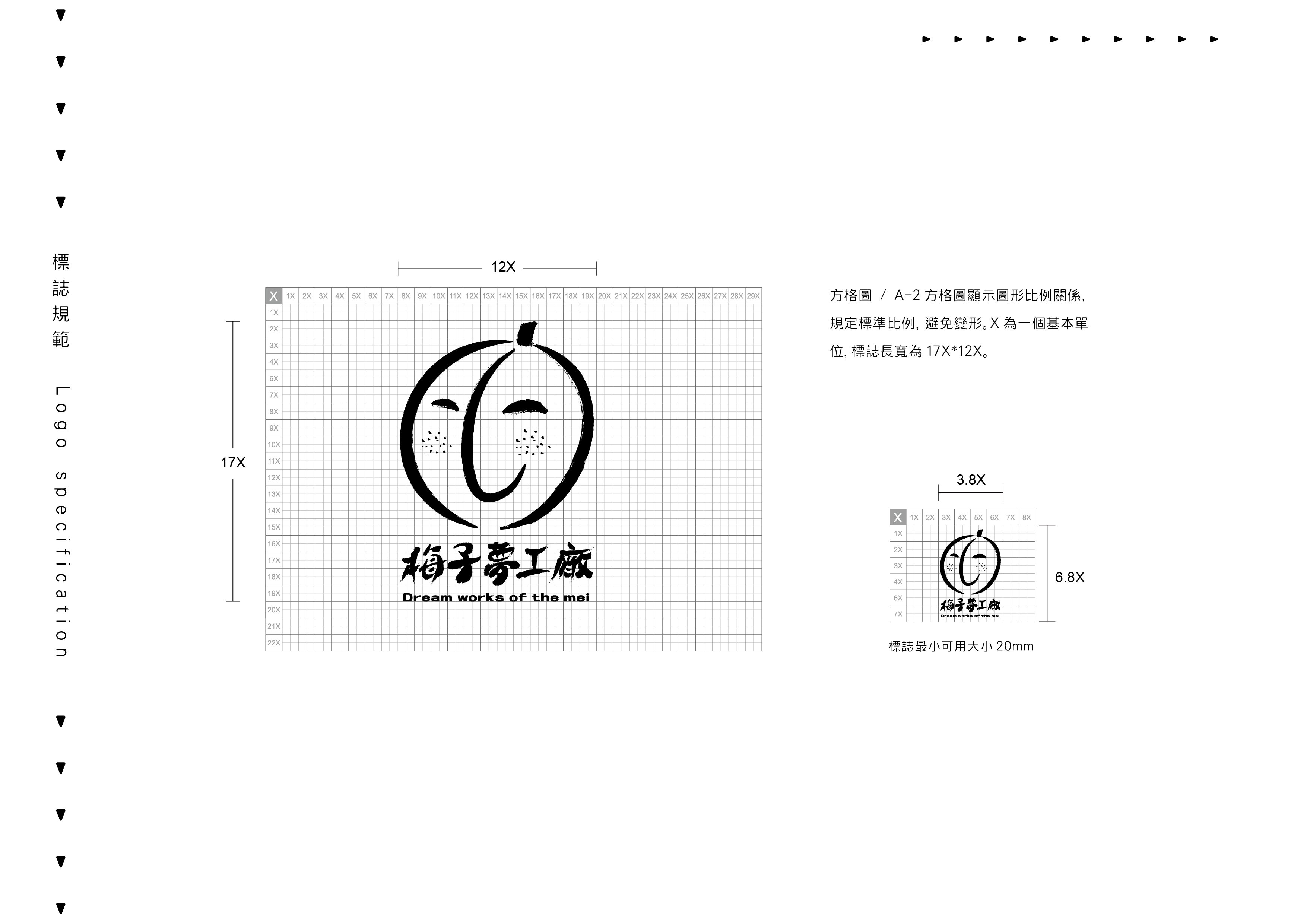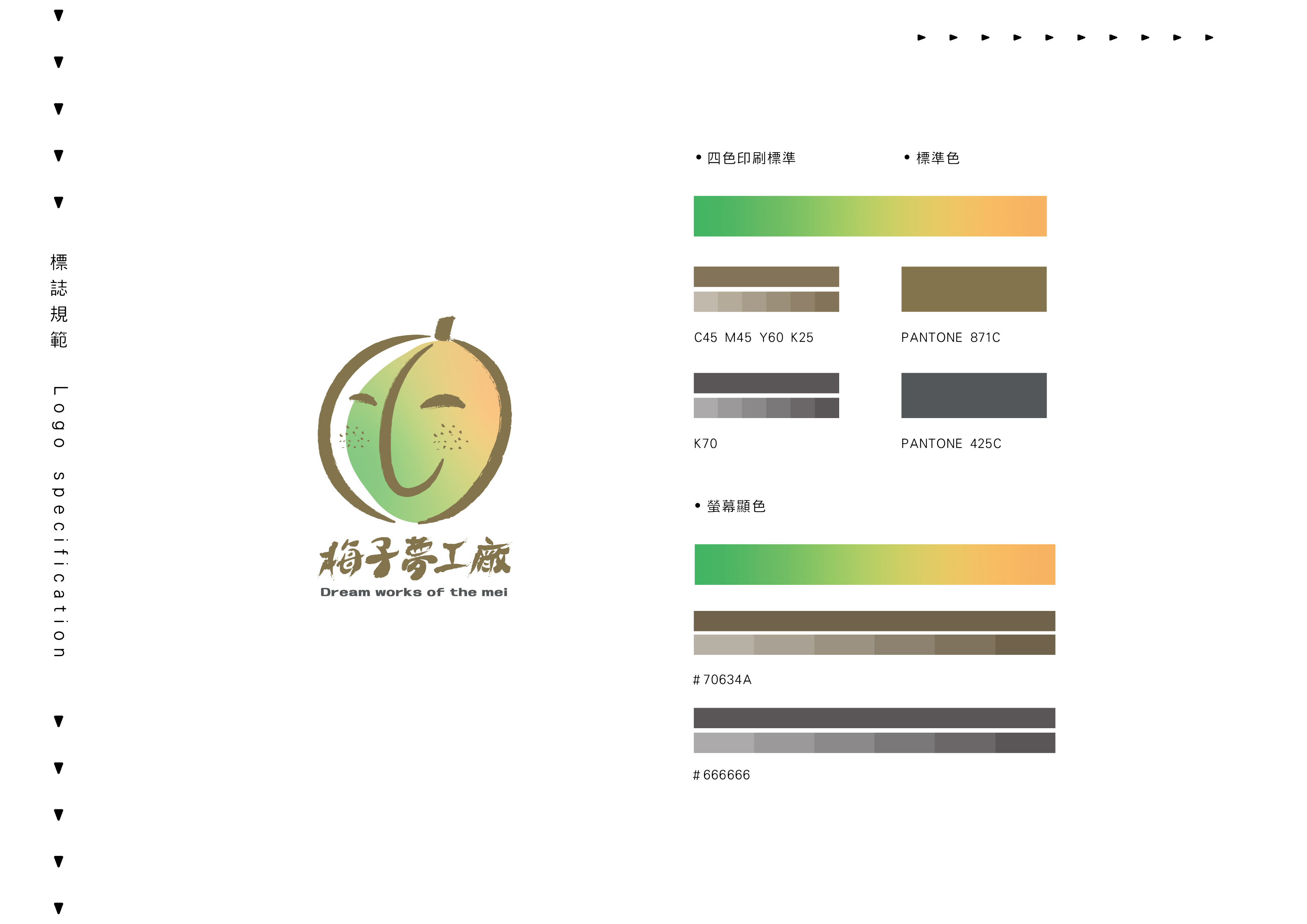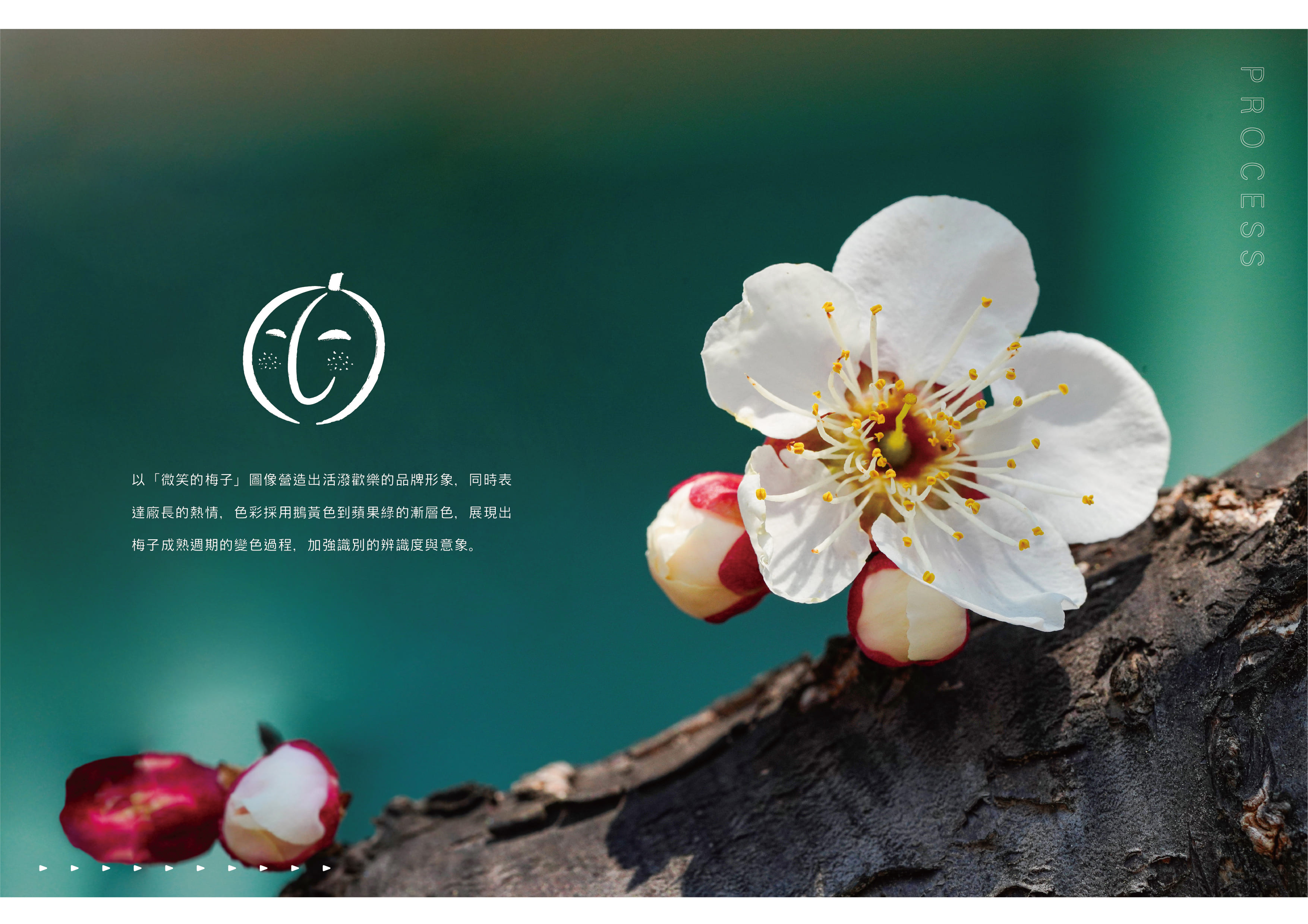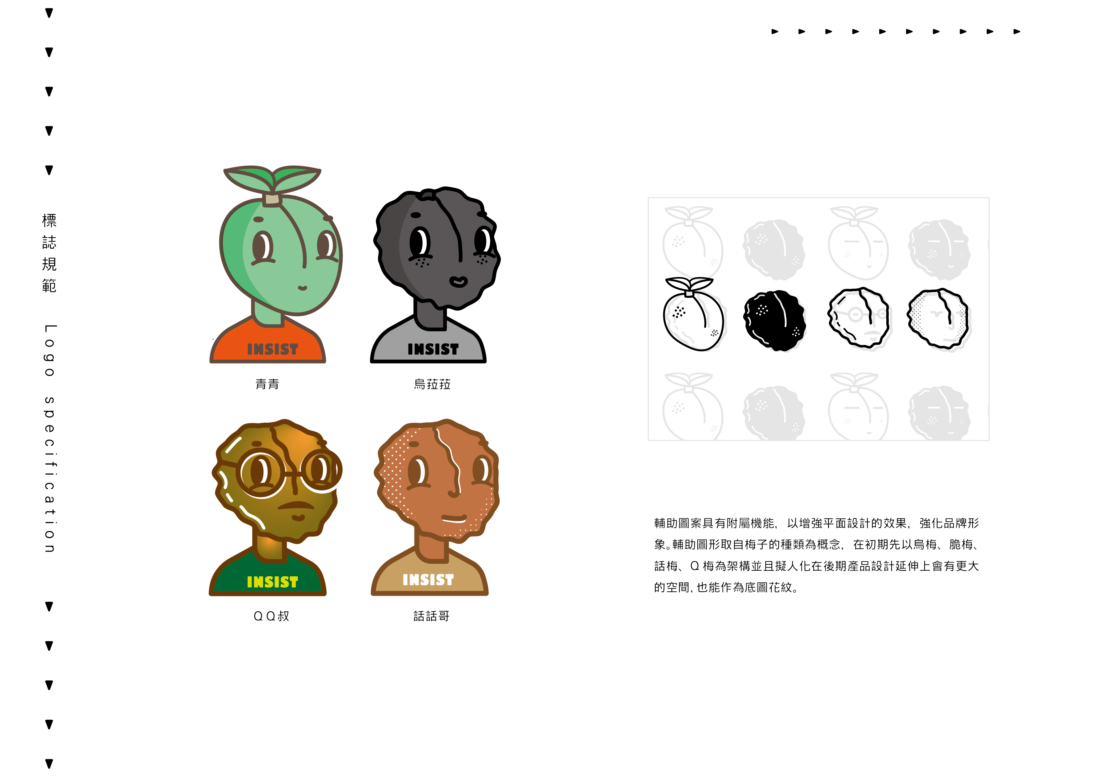那時在我心中產生的圖案是相當具象的,想加入親民的插畫卻又覺得這樣過於童趣,此時手邊的紙上留有我手畫梅子的初稿,這樣的筆觸加上簡單的線條,直接表達產業同時又具備親民的感覺,正在困擾在標誌中加入細節時,回想起了有“斑點的梅子”這件事情,將斑點做為健康的小雀斑,這樣多了層次更多了故事。
