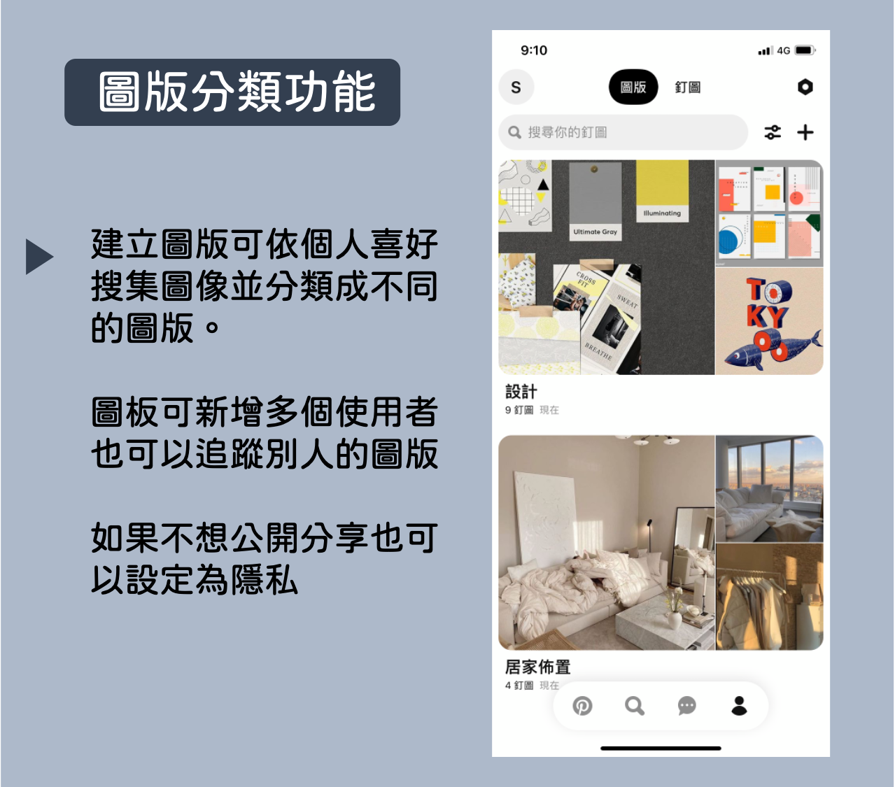 多以圖像形式呈現,藉由Pin(圖釘)這個功能,可以將圖片搜集起來